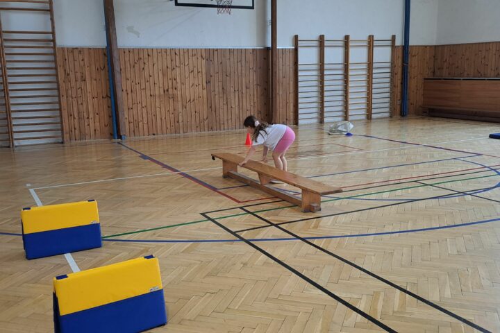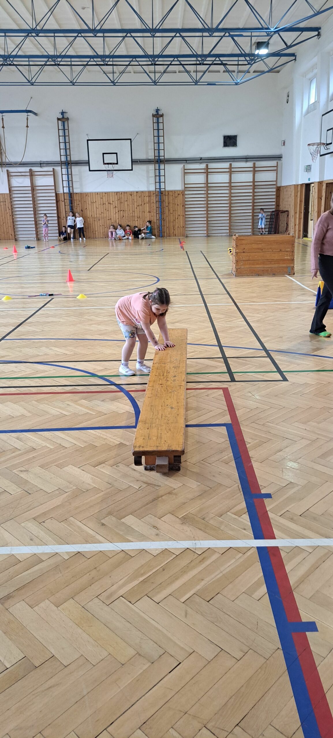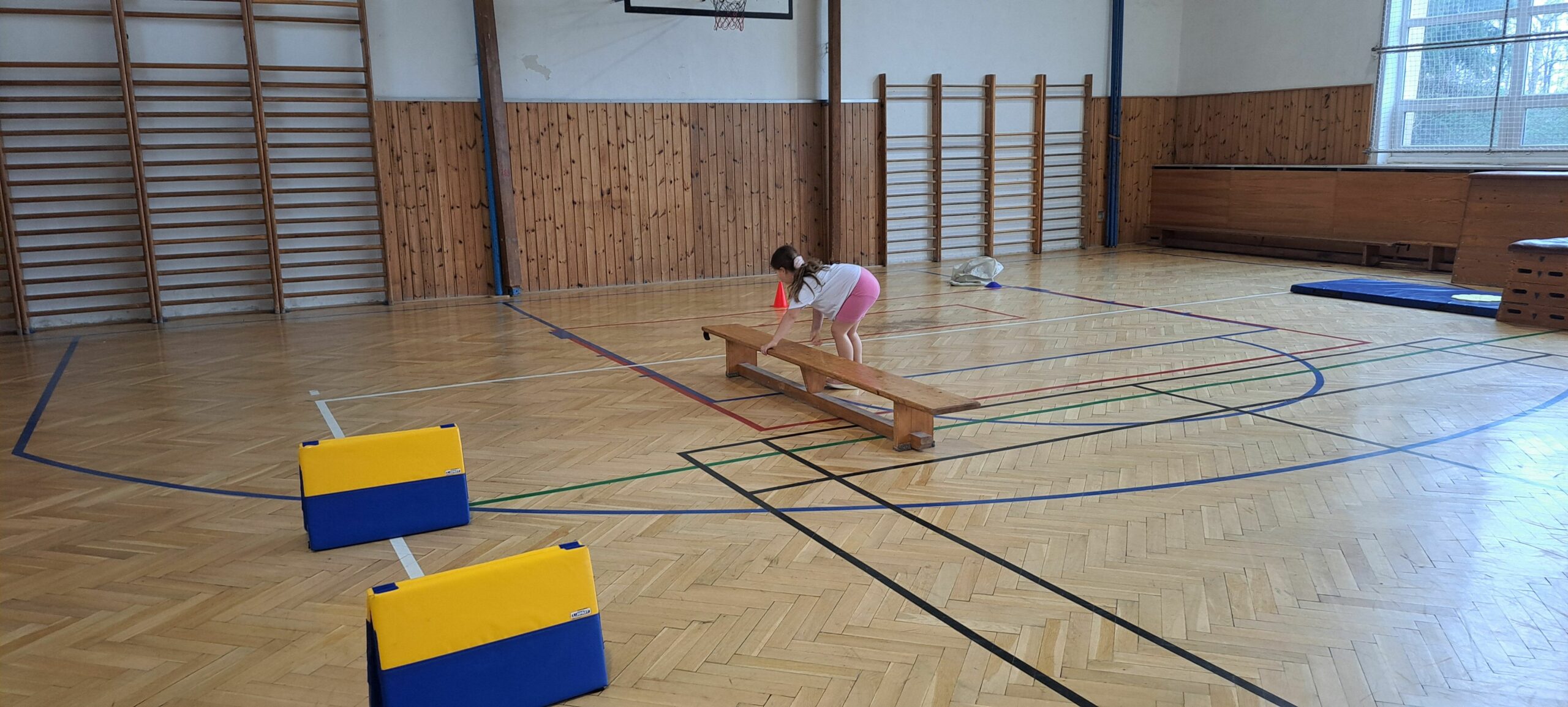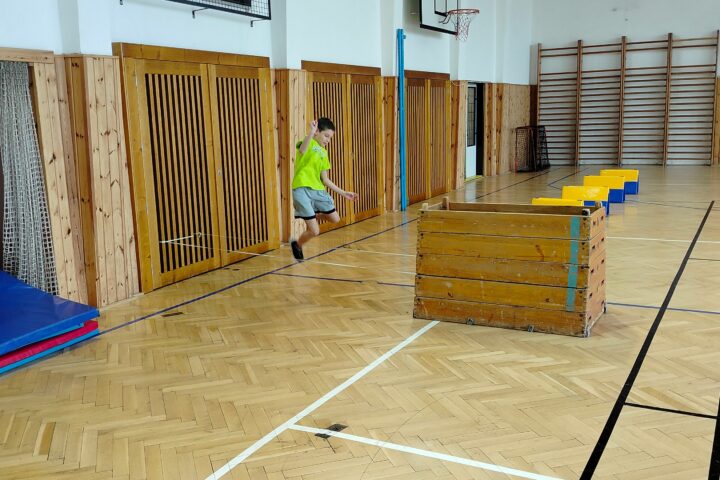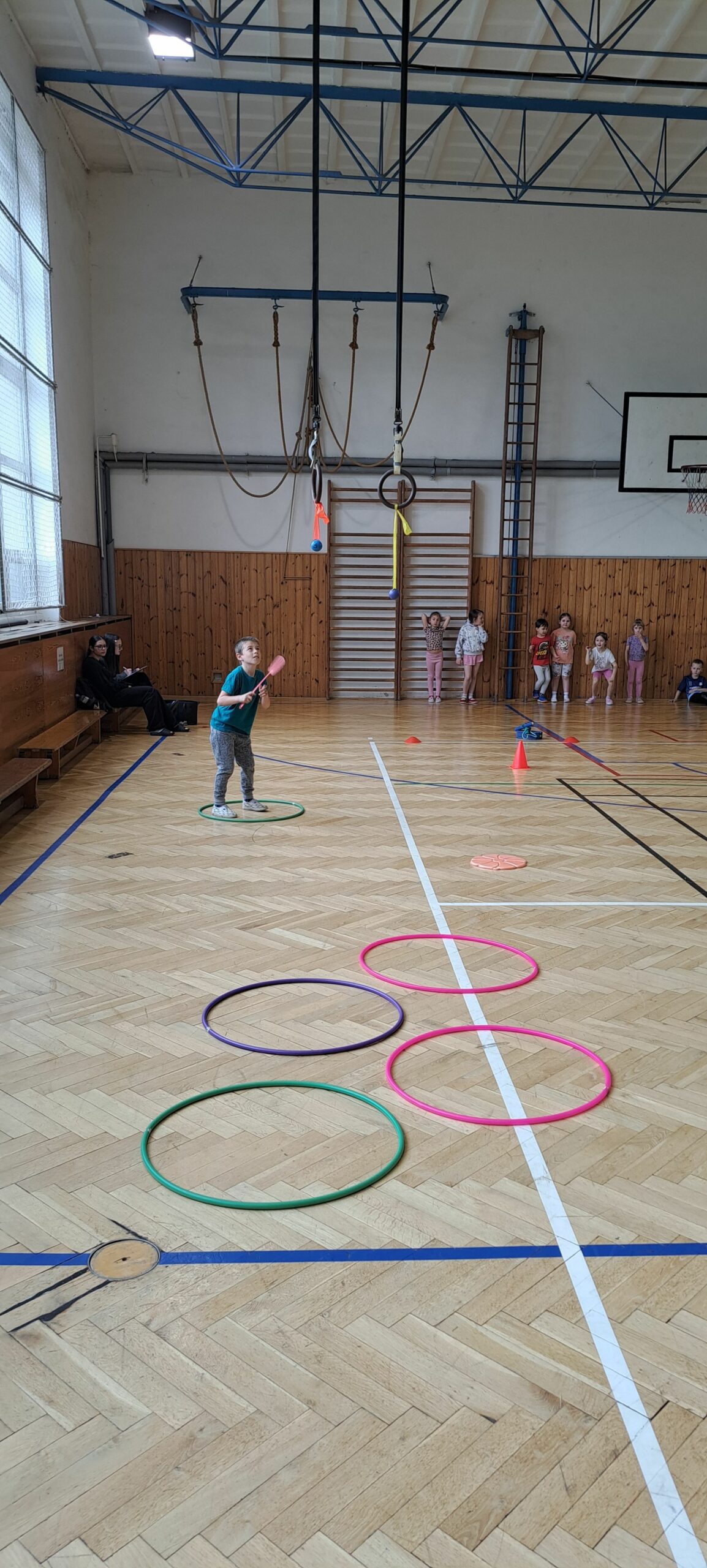 V tělocvičně čekala na děti dynamická překážková dráha měřená na čas. Nejrychlejší z každého ročníku si odnesli diplom a sladkou čokoládovou medaili. Děti postupně zdolávaly různorodé úkoly: skákání na skákadle kolem kuželu, trefování zavěšených míčků plácačkou (za přesný zásah si mohly odečíst cenných 5 sekund), přeskoky kruhů, výběh na švédské bedny se seskokem „do kytičky“ (nepovedený pokus naopak znamenal časovou penalizaci). Nechyběl ani skok v pytli, přeskoky přes švihadlo, lavičky (starší bez opory rukou, mladší s dopomocí), překážkový běh nebo oblíbená skákací guma. Závěr patřil slalomu se skoky snožmo.
