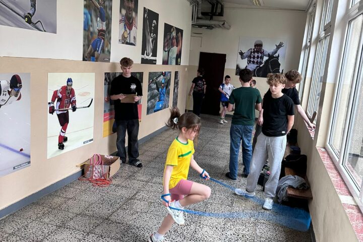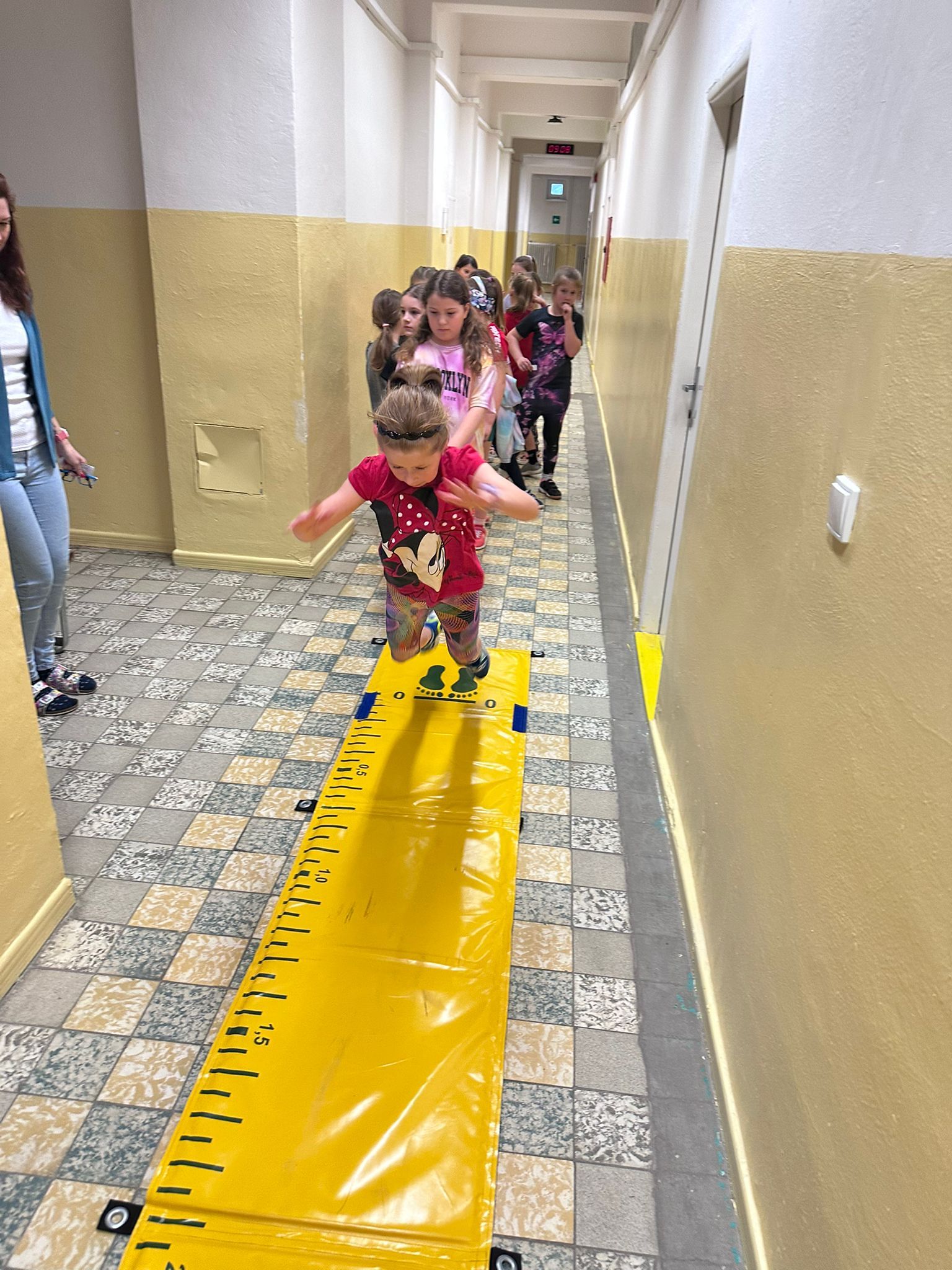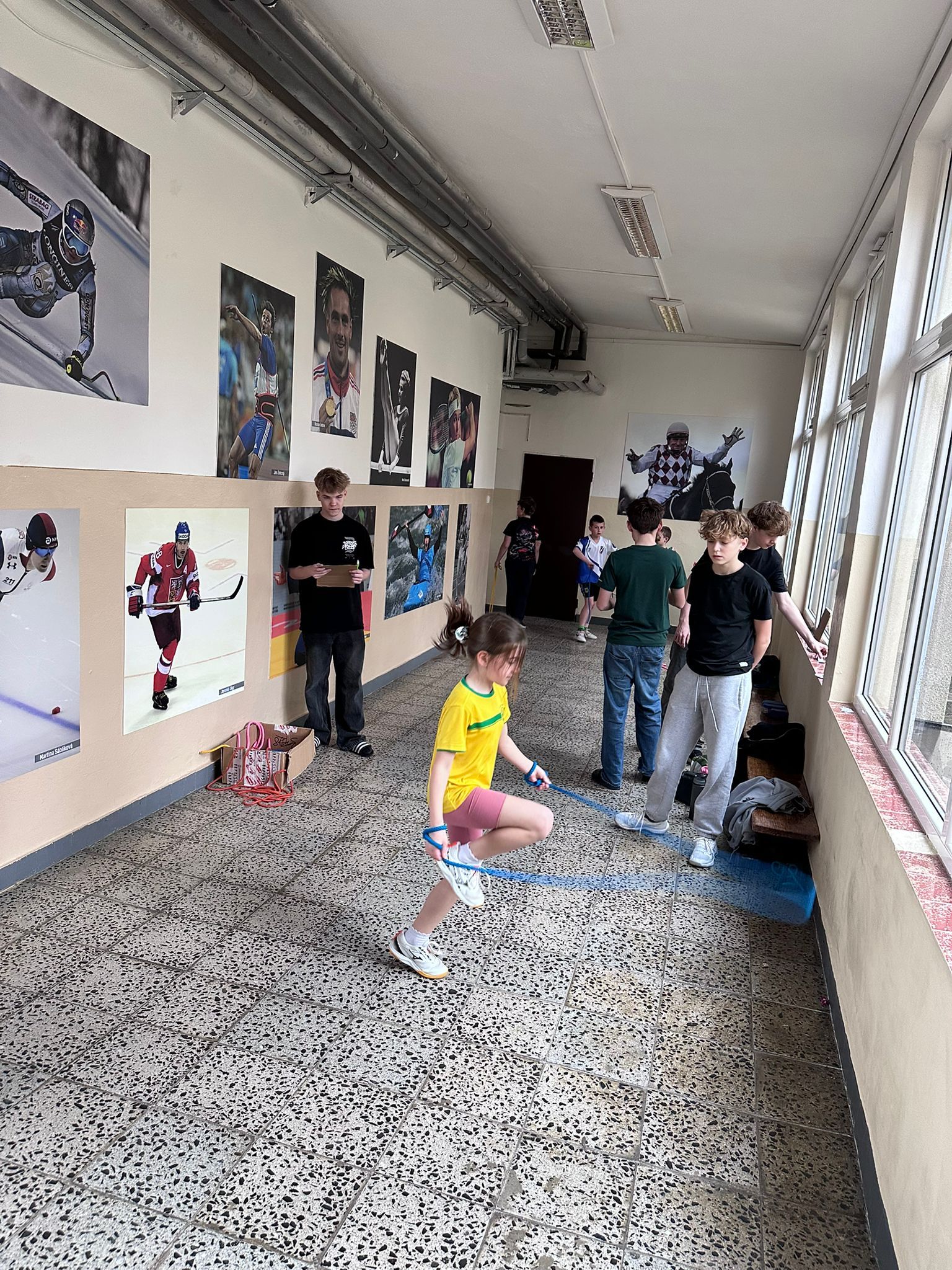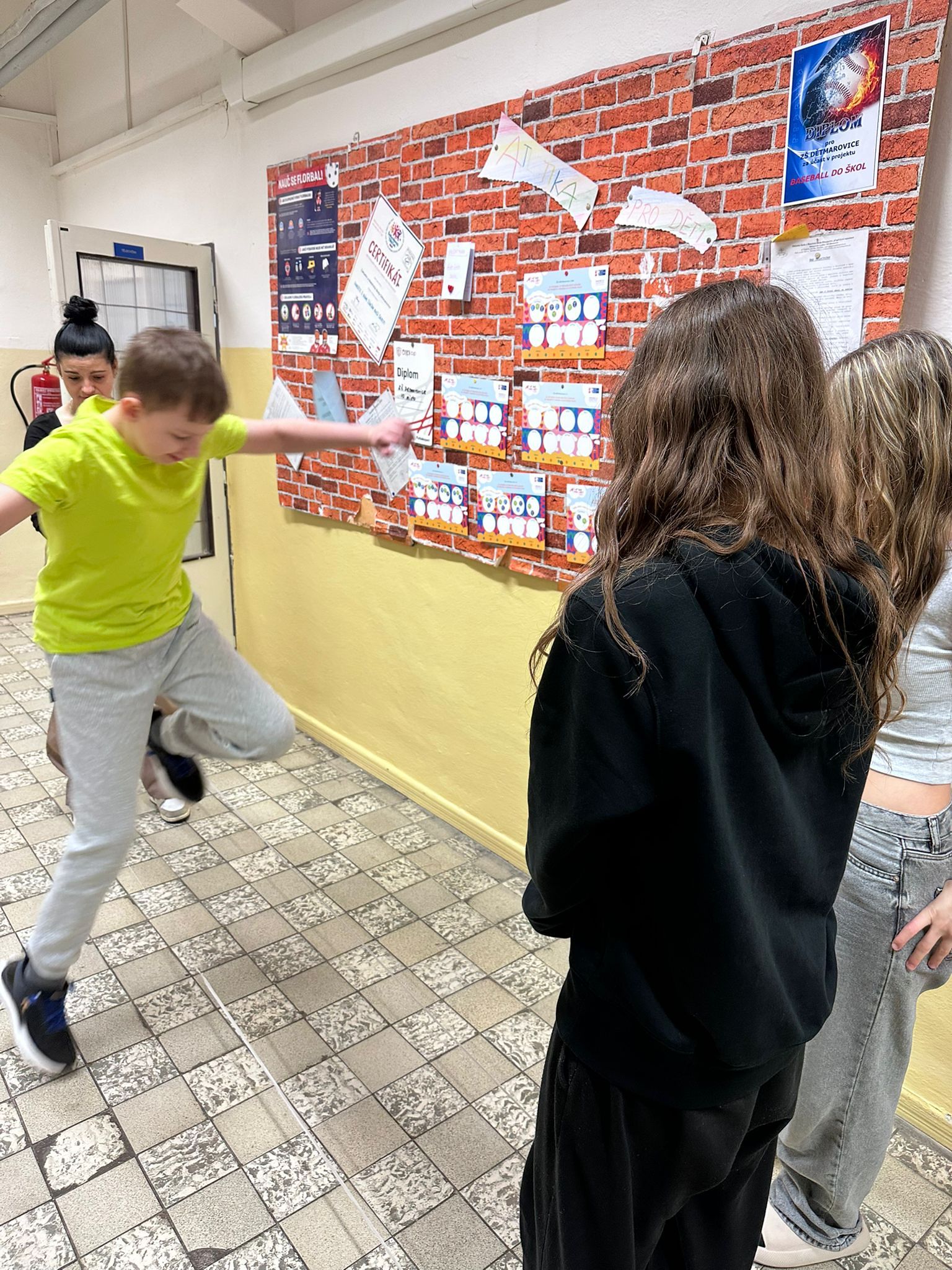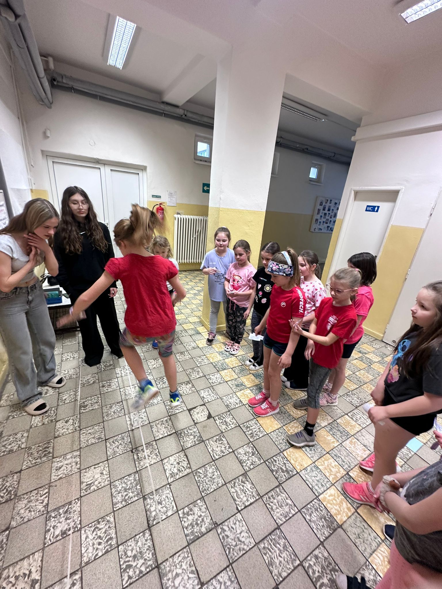 Na chodbě si děti mohly vyzkoušet soutěž v přeskocích přes švihadlo a skok do dálky z místa. Velkým zpestřením byla ukázka skákání gumy, kterou si pro mladší spolužáky připravili žáci 8. ročníku. Někteří si osvojili základní skoky, odvážnější se pustili i do složitějších variant s názvy jako jednoduchý a složitý pavouk, citrónky, panenky, chodičky nebo třeba „coca-cola“ či „pekař peče housky“.