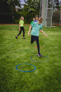 Na zemi umístíme v optimálních vzdálenostech kruhy nebo obruče. Úkolem dětí je přeskákat z ostrůvku na ostrůvek až na pevninu (vymezený prostor) aniž by se děti utopily (šláply vedle). Kdo vyšlápne, získává trestný bod. Pořadí přeskakování ostrůvků si určují samy děti. Měníme vzdálenosti obručí a způsoby přeskoků.
